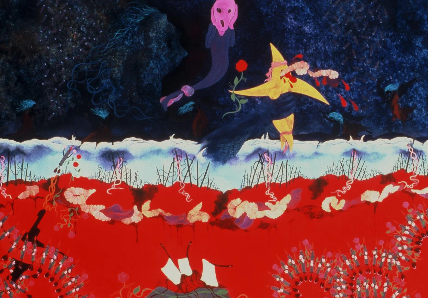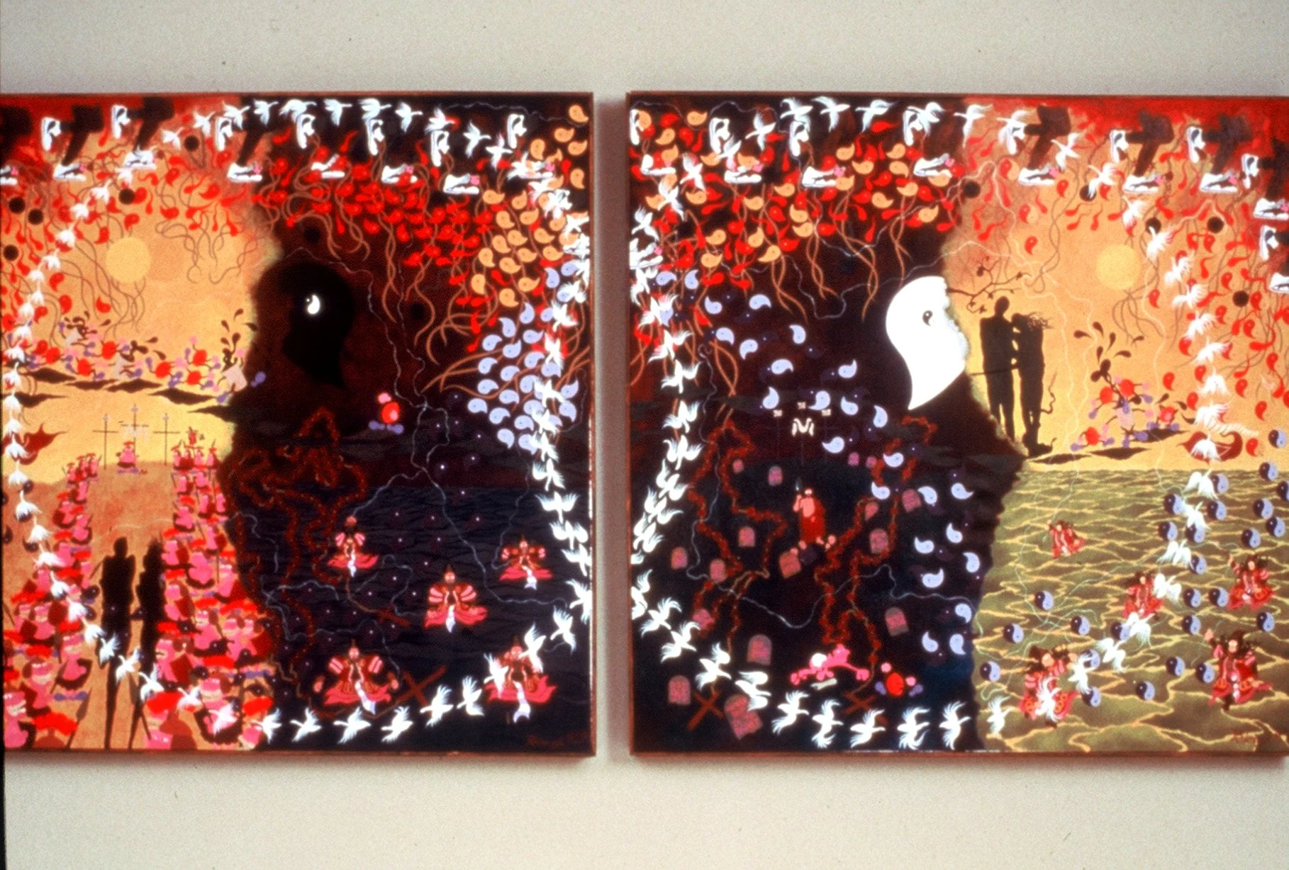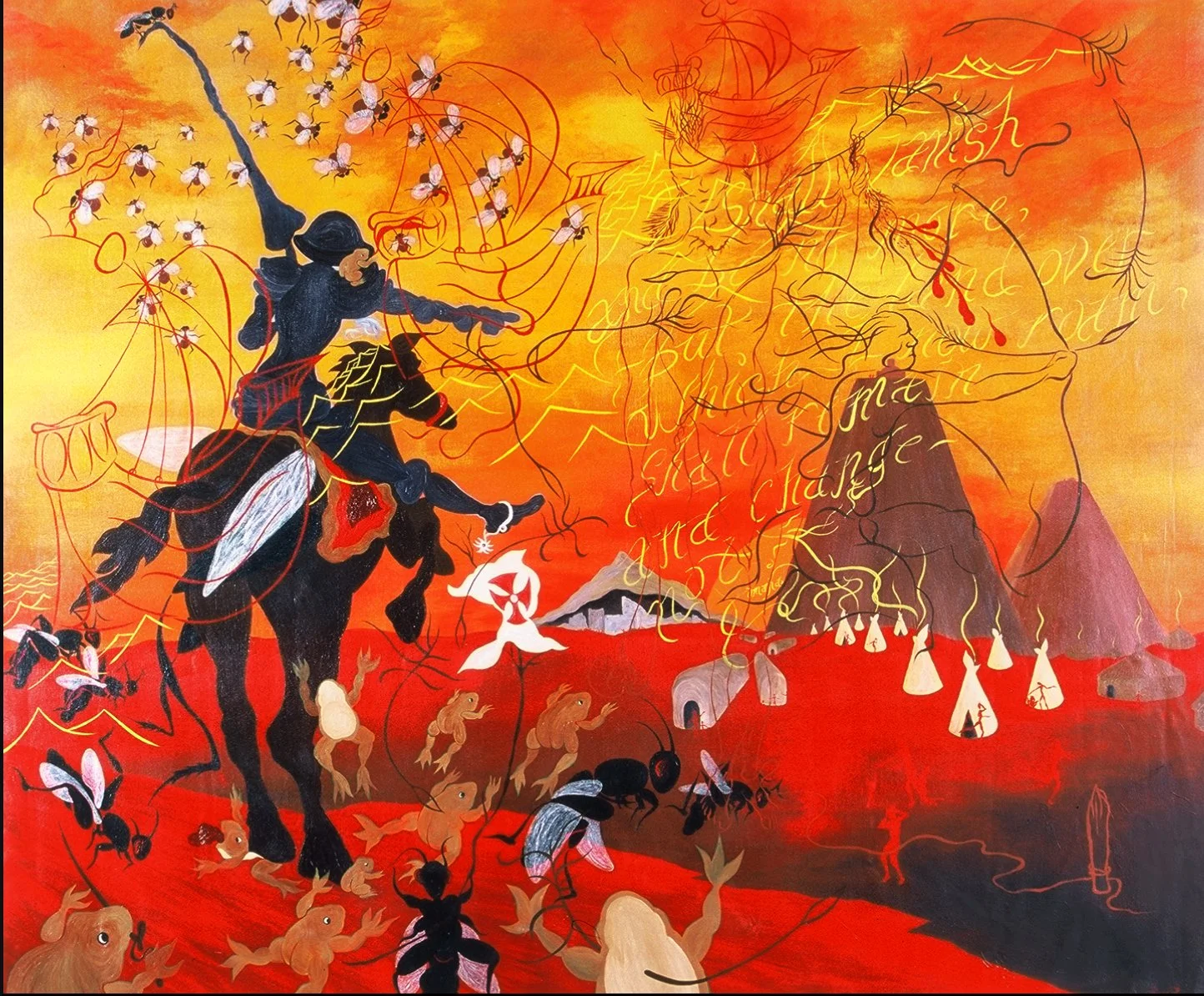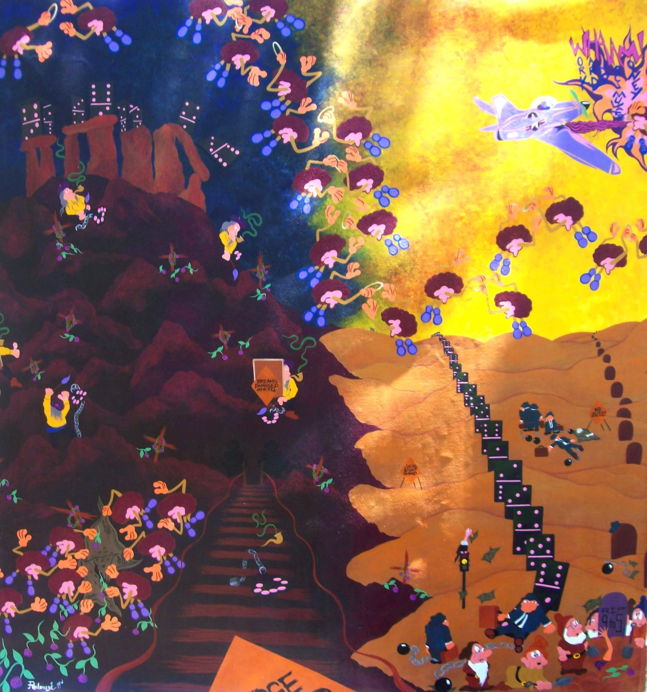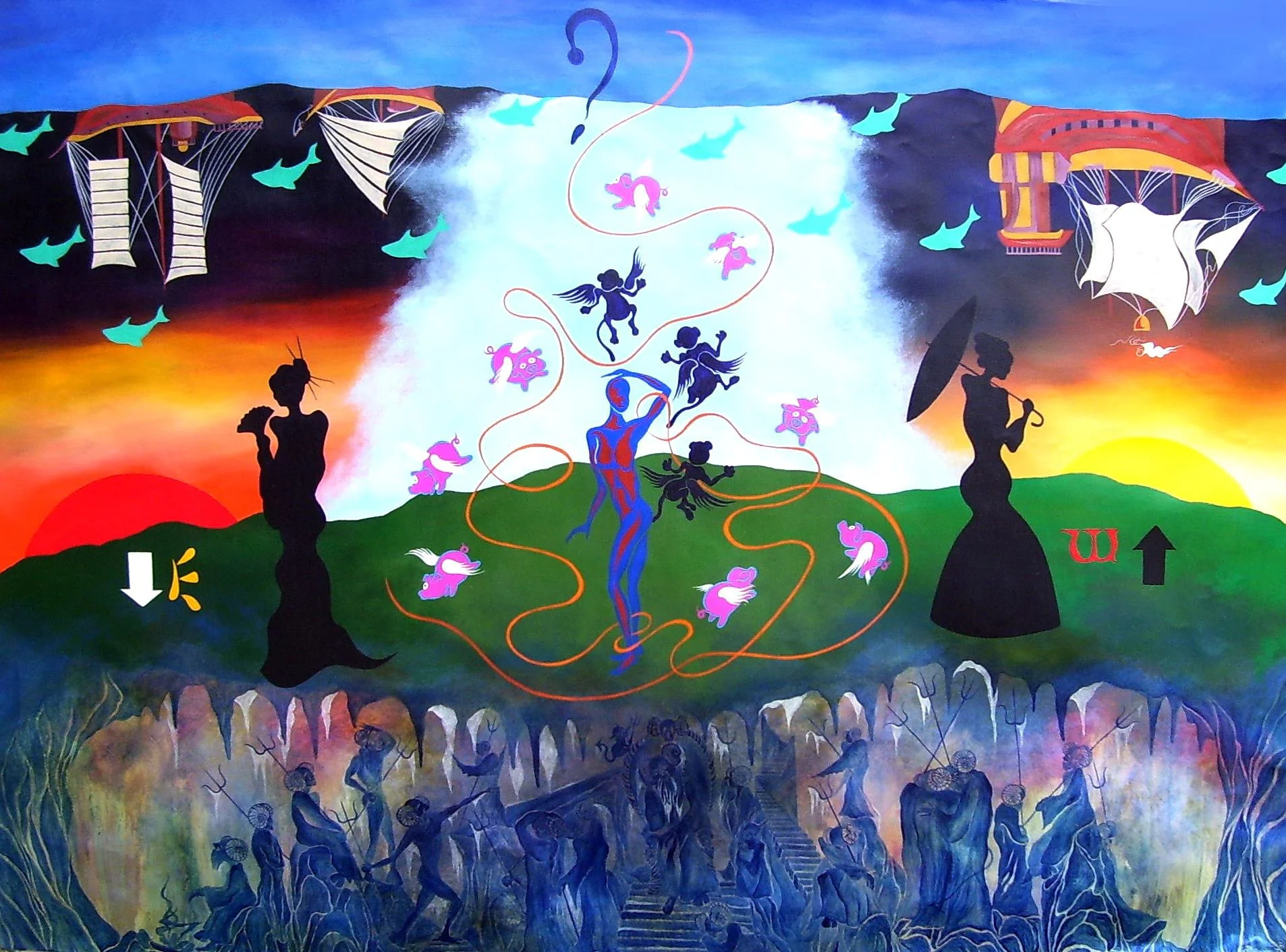"Only When: the world turns upside down, the sun sets in the East and rises in the West, pigs fly, monkeys fly out, and hell freezes over", 6' by 8'ft., acrylic/oil on canvas. R. Pilarczyk