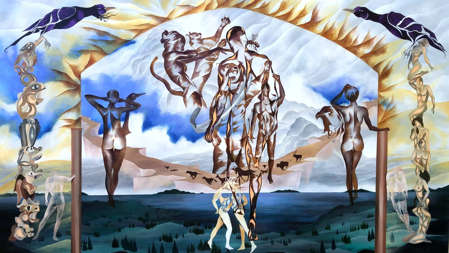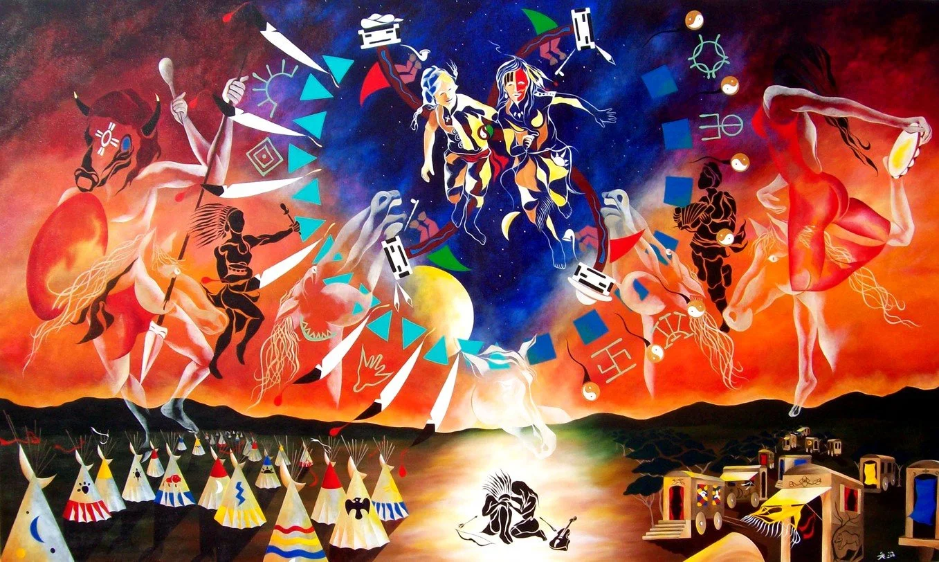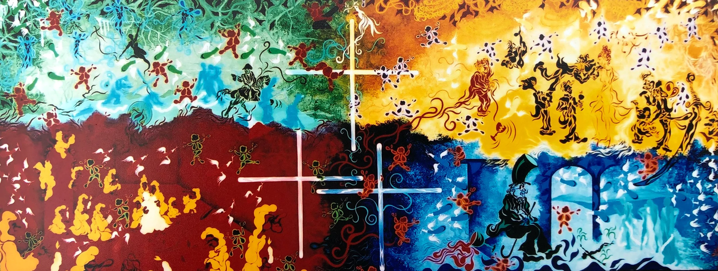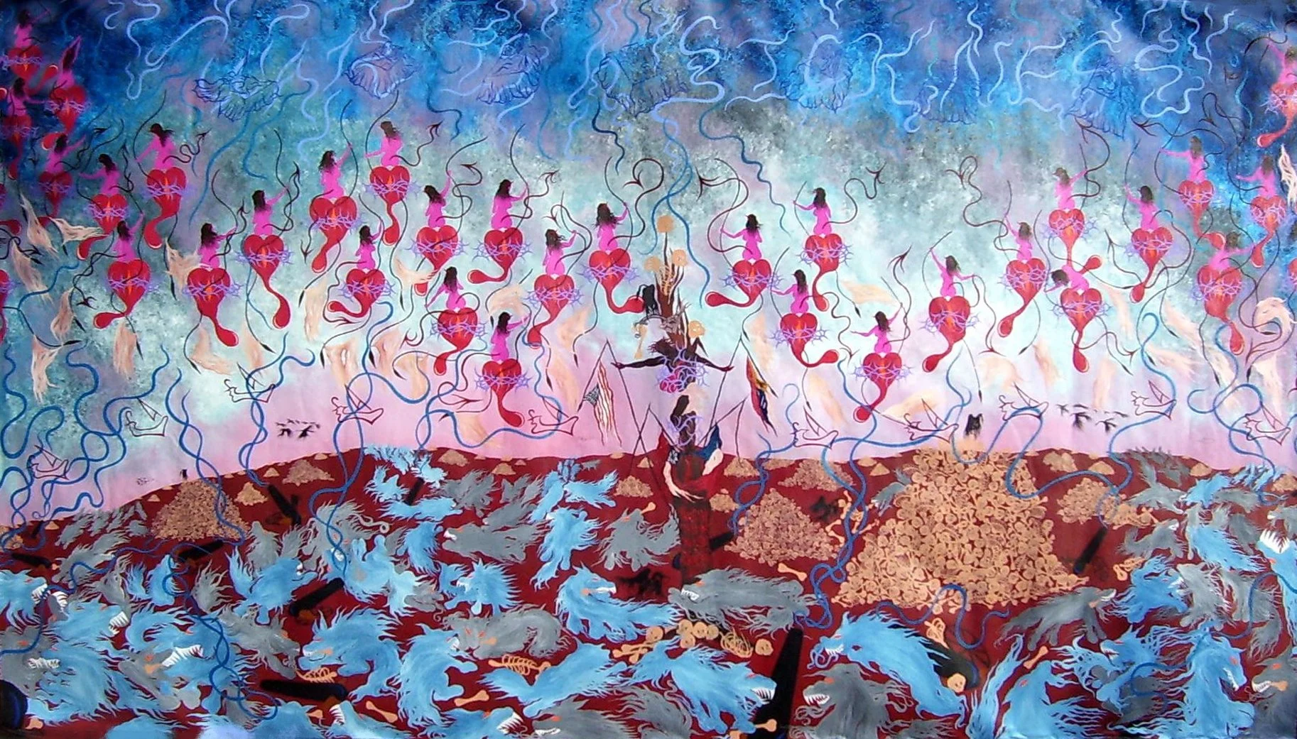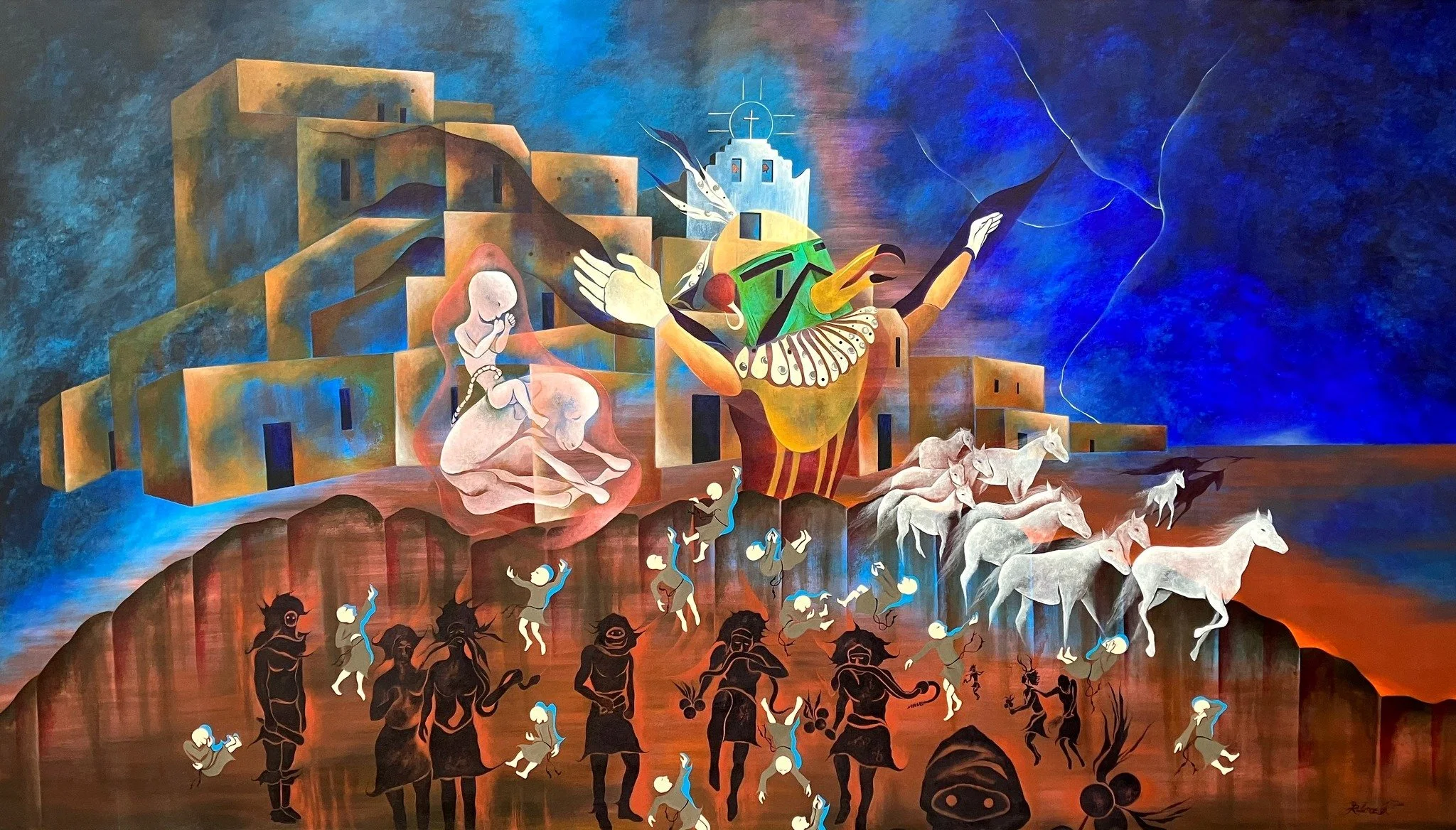 "Emergence; Lipan Apache creation story", 6' by 9'ft., acrylic/oil on canvas. R. Pilarczyk, Private collection- Texas, United States of America