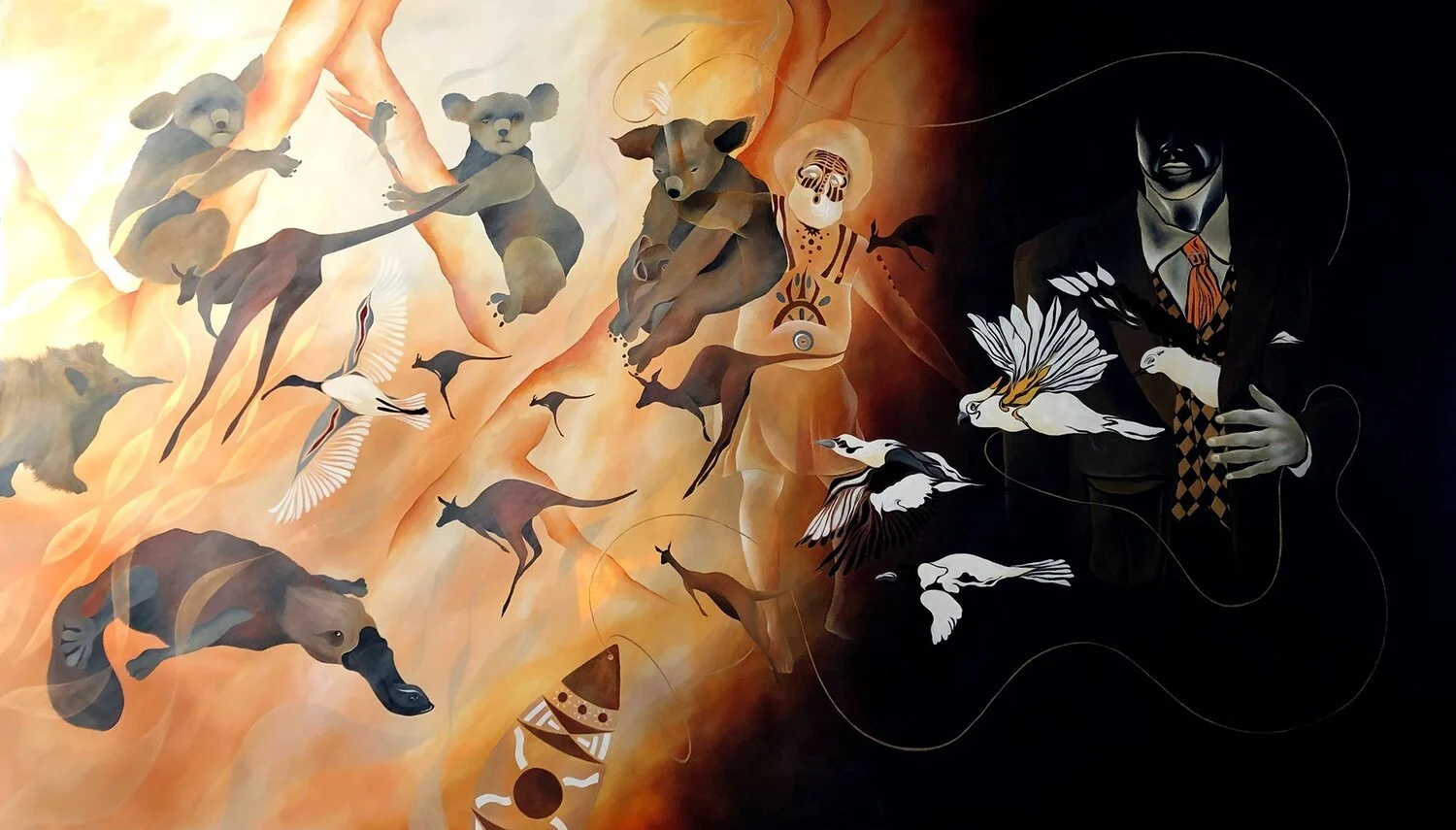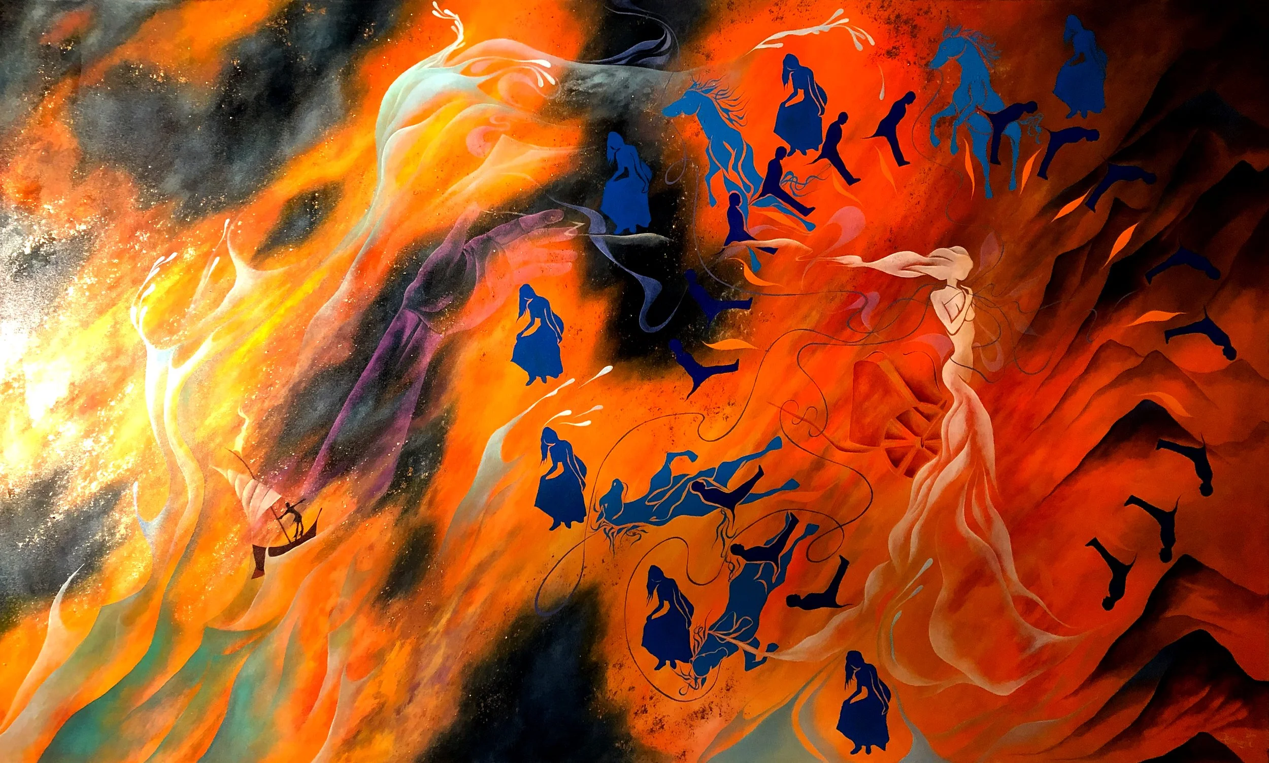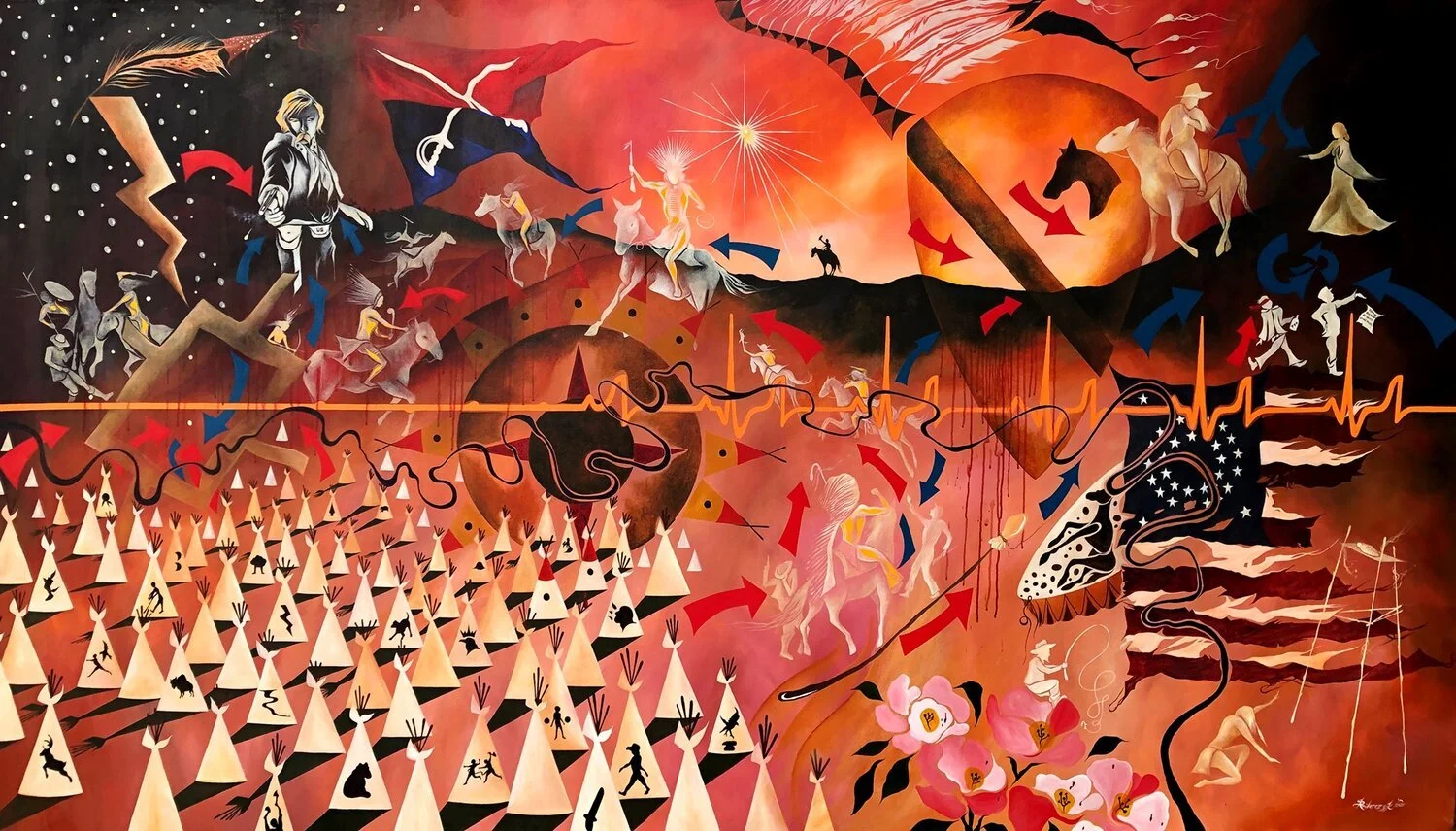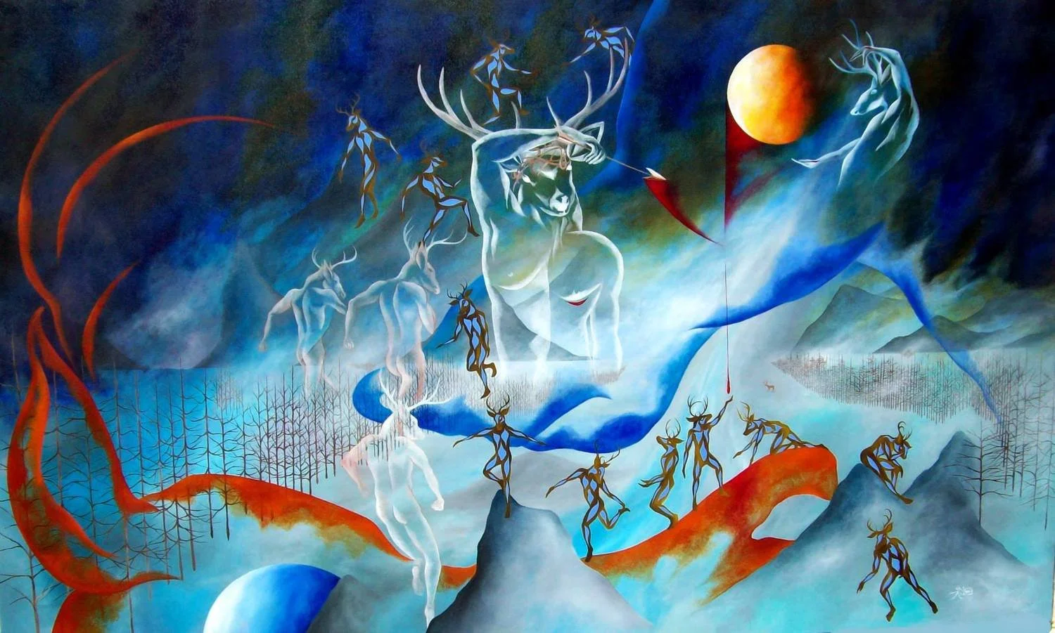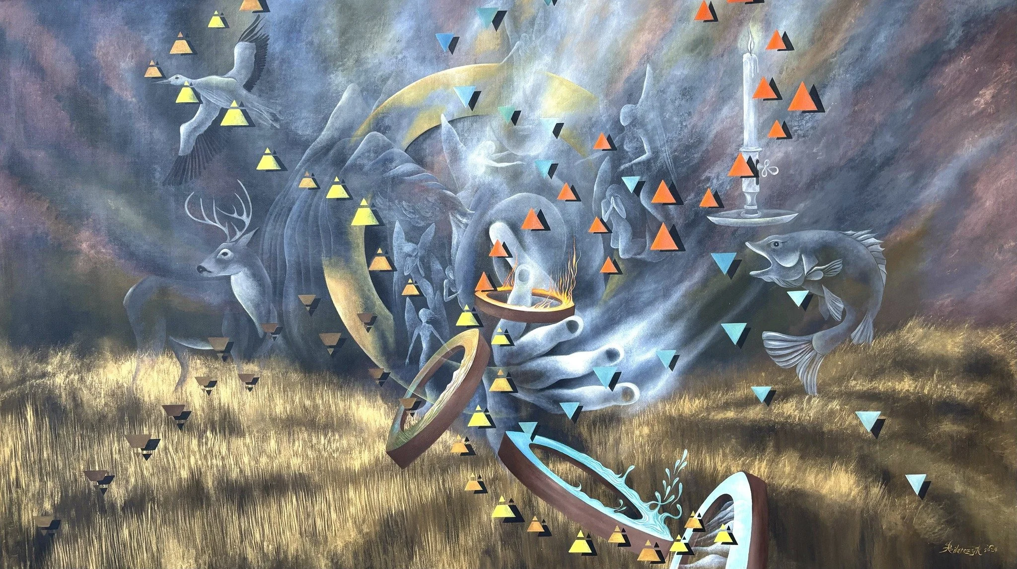 "Emergence; Lipan Apache creation story", 6' by 9'ft., acrylic/oil on canvas. R. Pilarczyk, Private collection- Texas, United States of America