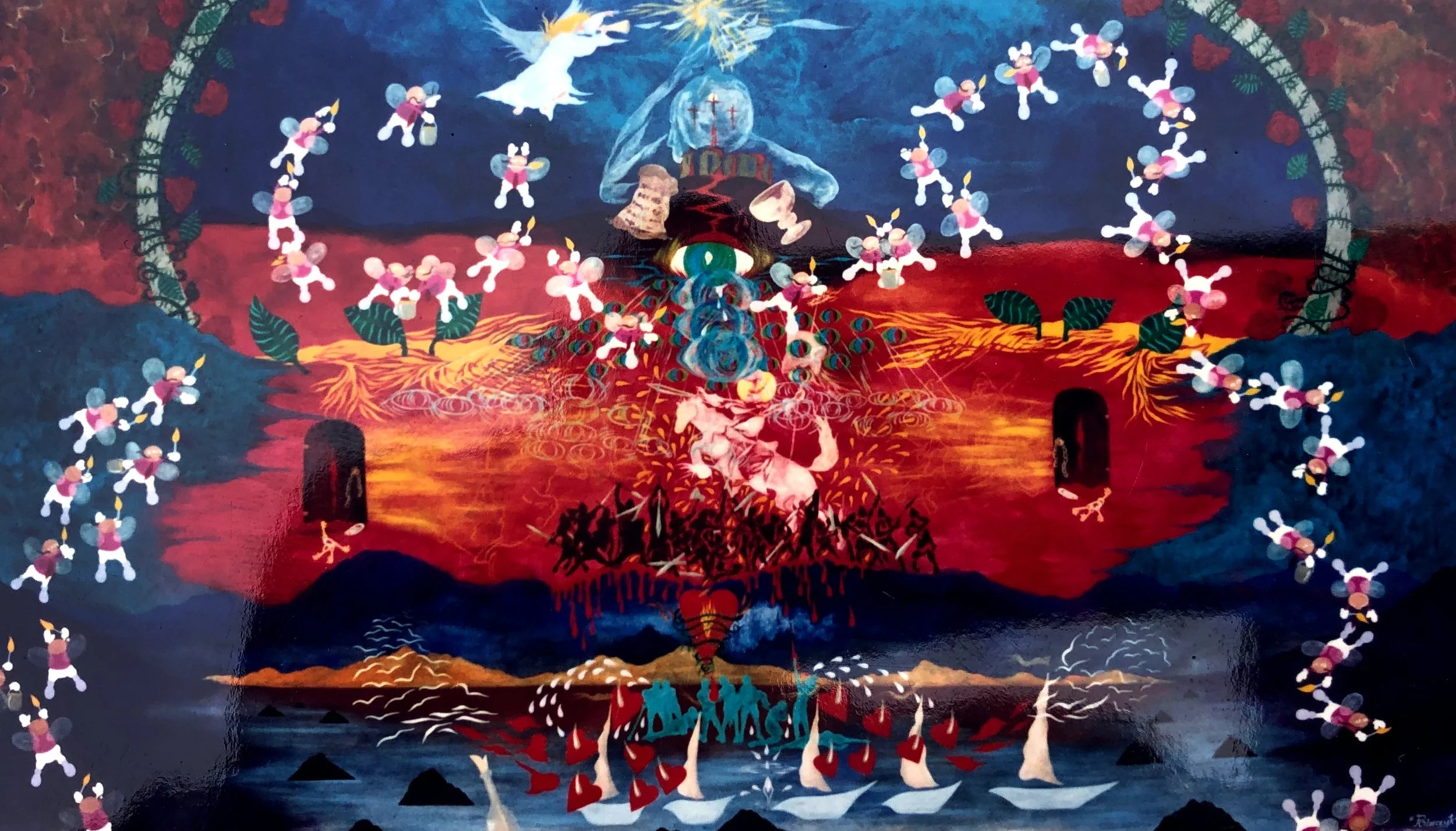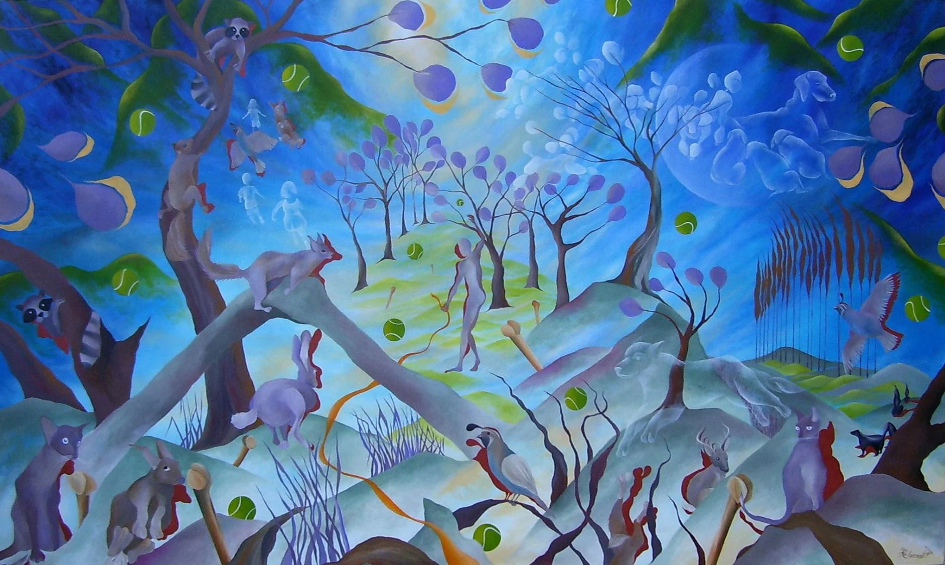 "Bosch and his Garden of Decadent Delights", 6' by 14'ft., acrylic/oil on canvas. R. Pilarczyk, Private collection- Colorado, United States of America
