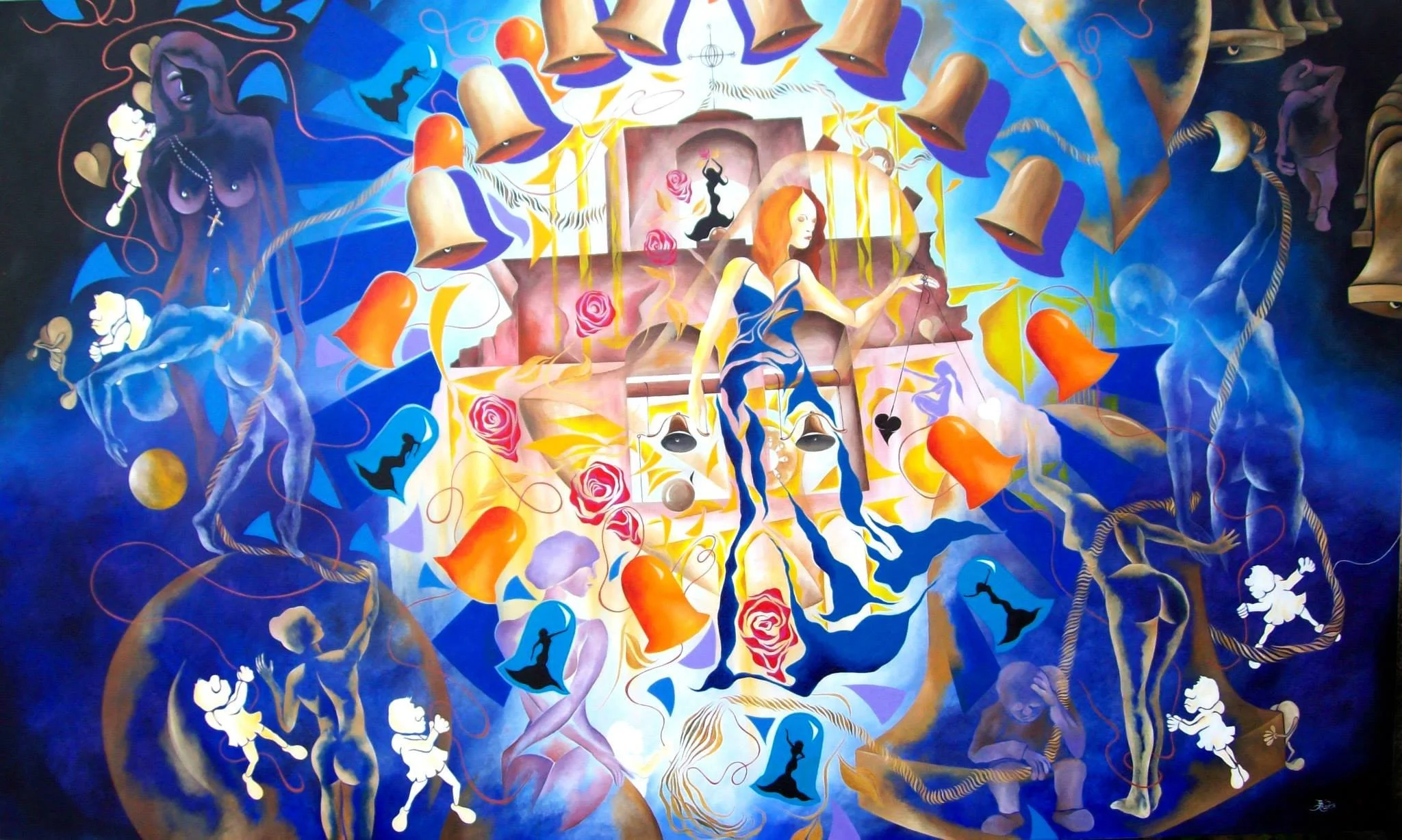 "For Whom the Bell Tolls; an ode to Hugo", 6' by 9'ft., acrylic/oil on canvas. R. Pilarczyk