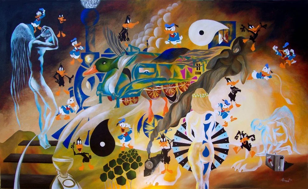 "The Mallard Ducktating Karma", 6' by 9'ft., acrylic/oil on canvas. R. Pilarczyk