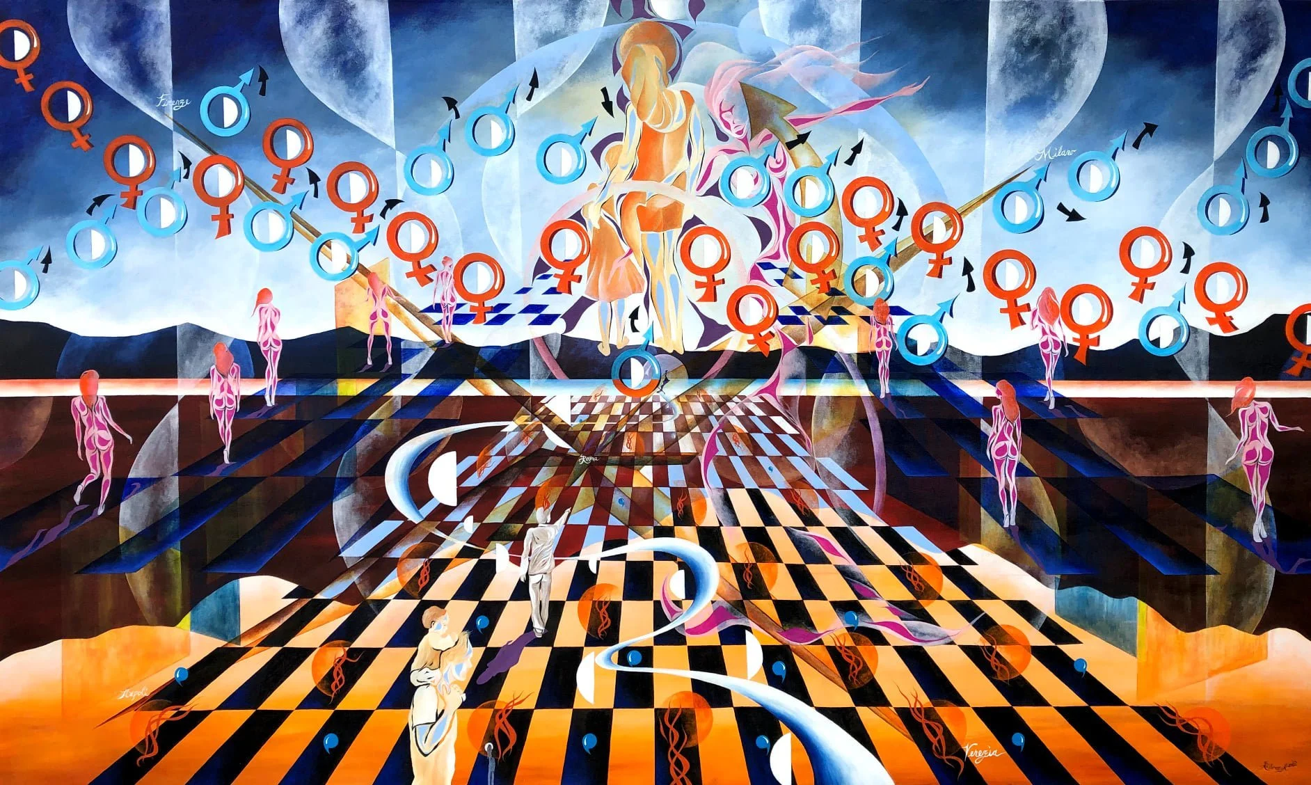"The Battle of the Sexes", 6' by 12'ft., acrylic/oil on canvas. R. Pilarczyk, Private collection- Texas, United States of America