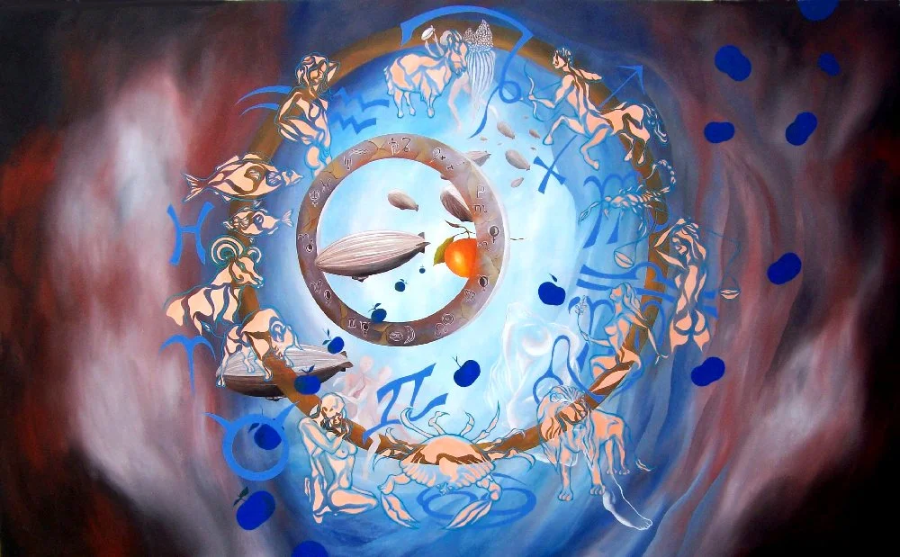 "Zodiac and Zeppelins", 6' by 9'ft., acrylic/oil on canvas. R. Pilarczyk, held by agent in Poland